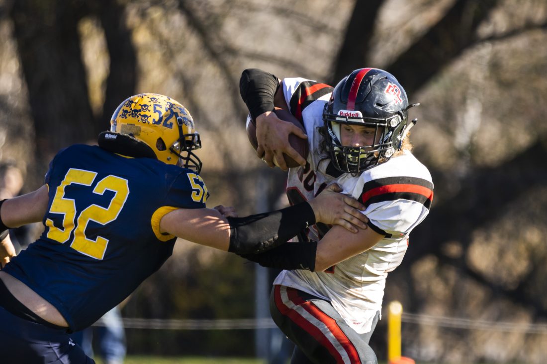 Forest Park’s Sam McKissack (31) rushes while being defended by Lake Linden-Hubbell’s Kirby Koskela (52) during a MHSAA 8-player Division 2 regional semifinal game on Saturday, Oct. 30, 2021, in Lake Linden, Mich. (Adam Niemi/The Daily Mining Gazette)