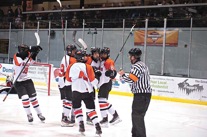 David Archambeau/For the Gazette The Gremlins’ Aaron Kogan (19), Camden Markham (9), Kade Farrell (4), Landon Stevens (13) and Gaborik Carlson (8) celebrate a goal during the semifinals of the John MacInnes Holiday Hockey Classic in December at the MacInnes Student Ice Arena in Houghton.