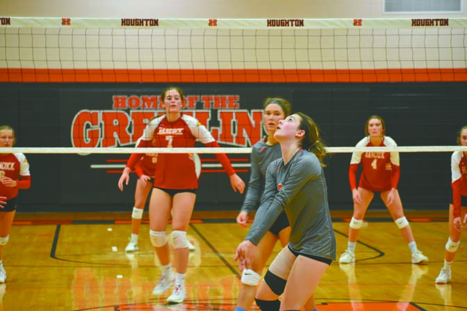 Houghton’s Laney Johnson (center) prepares to bump the ball Thursday in their game against Hancock at the Houghton gym. (Eddie O’Neill/Daily Mining Gazette)