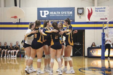 - The Lakes’ Olivia Shank (3), Brooke Banfield (8) and Sidney Griffen (2) huddle up with teammates after earning a point during a match against against the Panthers Monday night in Chassell. (Eddie O’Neill/Daily Mining Gazette)