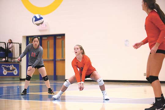 The Gremlins’ Clea Ollanketo (2) digs the ball as Jiani Tang (13) looks on. (Traiche Raiche/For the Gazette)