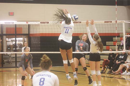 - The Gremlins’ Annika Peterson goes up for the kill during a match against the Hematites in the Houghton gym Thursday. Attempting the block are Mya Hemmer (11) and Payton Manninen (3) of the Hematites. (Eddie O’Neill/Daily Mining Gazette)