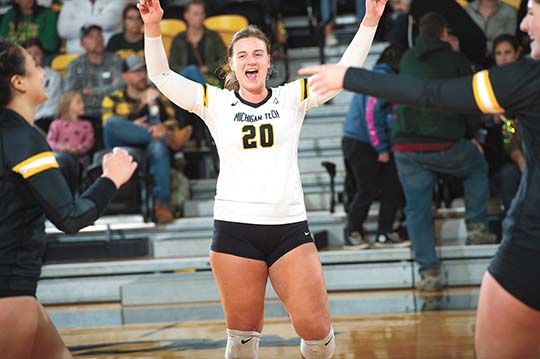 Michigan Tech’s Carissa Beyer (20) celebrates after a point with her teammates during a match against Wayne State on Saturday, Oct. 8, at the SDC Gym in Houghton. (David Archambeau/For the Gazette)