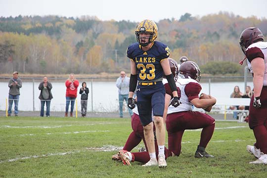 The Lakes’ Mason Holzberg shows some emotion after stopping a Gladiators running back from gaining any yardage during a game Saturday at Warner Athletic Field. (Eddie O’Neill/Daily Mining Gazette)
