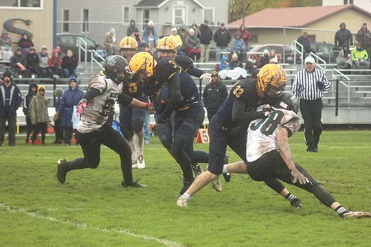 LAKE LINDEN — The Lake Linden-Hubbell Lakes scored early and often in their 50-0 thrashing of the Gogebic Miners (2-6) on Saturday at Warner Field in Lake Linden. On a wet and muddy grass field, the running game was key, and the Lakes (5-3) did a much better job of it than their opponents. They outran the Miners, 265-19, on an equal number of plays (33). According to the Lakes coach Brett Gervais, that was the game plan, and it worked.