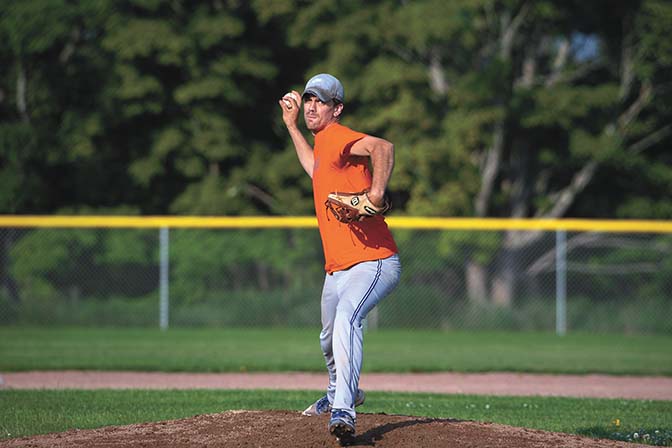 Garnet Garage starting pitcher Chris Saari readies to deliver a pitch during game against Northern Driveline Thursday in Houghton. (David Archambeau/For the Gazette)