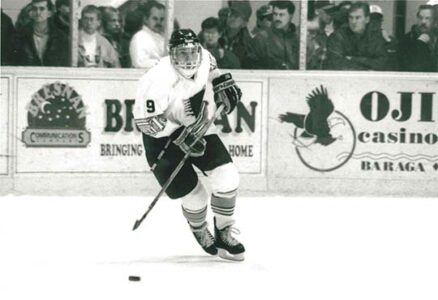 - Former Michigan Tech forward Pat Mikesch skates up the ice with the puck during the 1995-96 season at the MacInnes Student Ice Arena in Houghton. (Photo provided by Michigan Tech University)