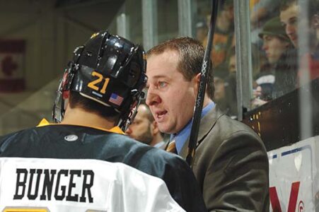 - Former Michigan Tech assistant coach Pat Mikesch addresses forward Ryan Bunger during game against Wisconsin in 2006 at the MacInnes Student Ice Arena In Houghton. Mikesch was named the head coach of the Toledo Walleye of the ECHL last week. (Photo provided by Michigan Tech University)