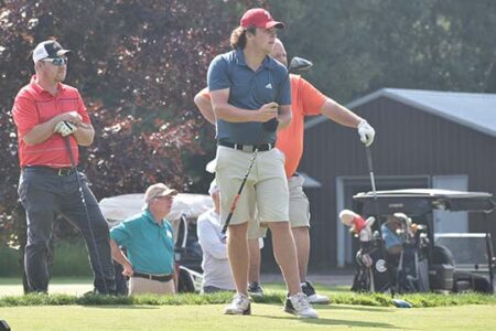 Portage Lake Golf Course golfer Jackson Sinkowski watches his opening drive of the UPGA Men’s Championship tournament Wednesday morning in Houghton. (Daver Karnosky/Daily Mining Gazette)