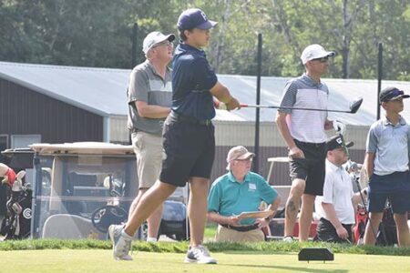 - Portage Lake Golf Course golfer Caleb Acciacca finishes his follow through after his opening drive of the UPGA Men’s Championship tournament Wednesday morning in Houghton. (Daver Karnosky/Daily Mining Gazette)