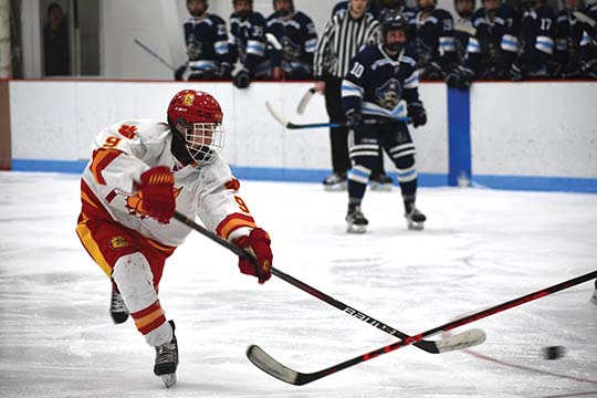 Hancock forward Brady Axford shoots the puck during the first period of a game against Bay Port Saturday at the Houghton County Arena. Axford scored on the play. (Daver Karnosky/Daily Mining Gazette)