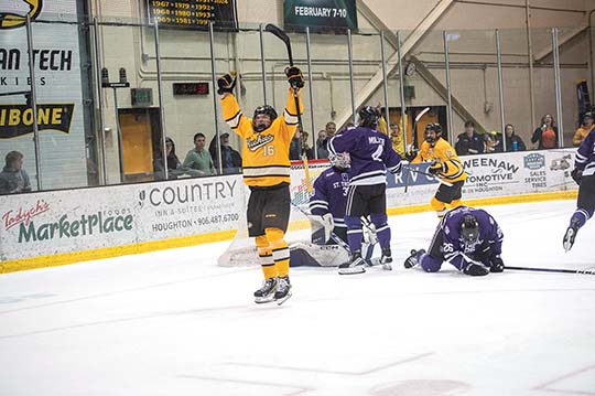 Michigan Tech winger Isaac Gordon celebrates after scoring a goal in the second period of a game against St. Thomas Saturday at the MacInnes Student Ice Arena. (David Archambeau/For the Gazette)