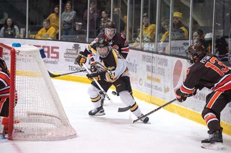 - Michigan Tech forward Blais Richartz battles behind the Browling Green State goal with a pair of Falcons defenders during a game Saturday, Dec. 2, at the MacInnes Student Ice Arena in Houghton. (David Archambeau/For the Gazette)