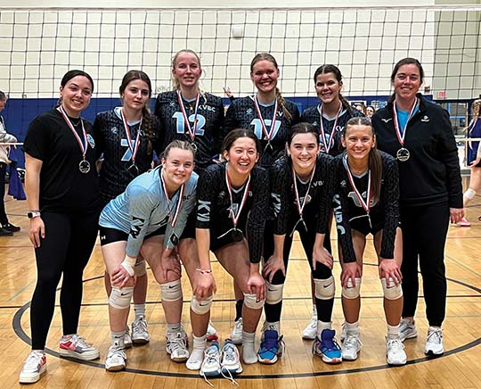 Keweenaw VBC’s 18s team celebrate as runners-up in the Spring Classic Tournament in Duluth, Minnesota. Pictured in the top row (from left): Assistant coach Leiya Rybicki, Allison Corrigan, Madelyn Torola, Allison Bjorn, Brielle Kero, and head coach Cindy Pindral. In the bottom row (from left): Abi Codere, Sophia Neves, Laney Johnson, and Brooke Koskela. (Photo submitted)