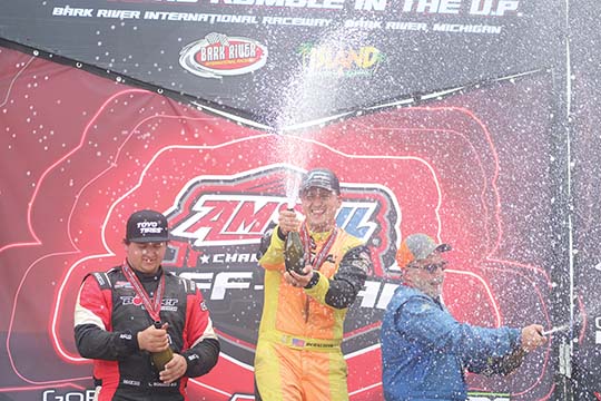 Lorenzo Bonacci (left), Jordan Bernloehr (middle) and Mark Steinhardt celebrate with champagne after a Pro Buggy race during the 2024 Off-Road Rumble in the U.P. on Aug. 10, 2024, at Bark River International Raceway in Bark River. Bernloehr won the race with Bonacci finishing second and Steinhardt finishing third. (Mitch Vosburg/Daily Press (Escanaba))