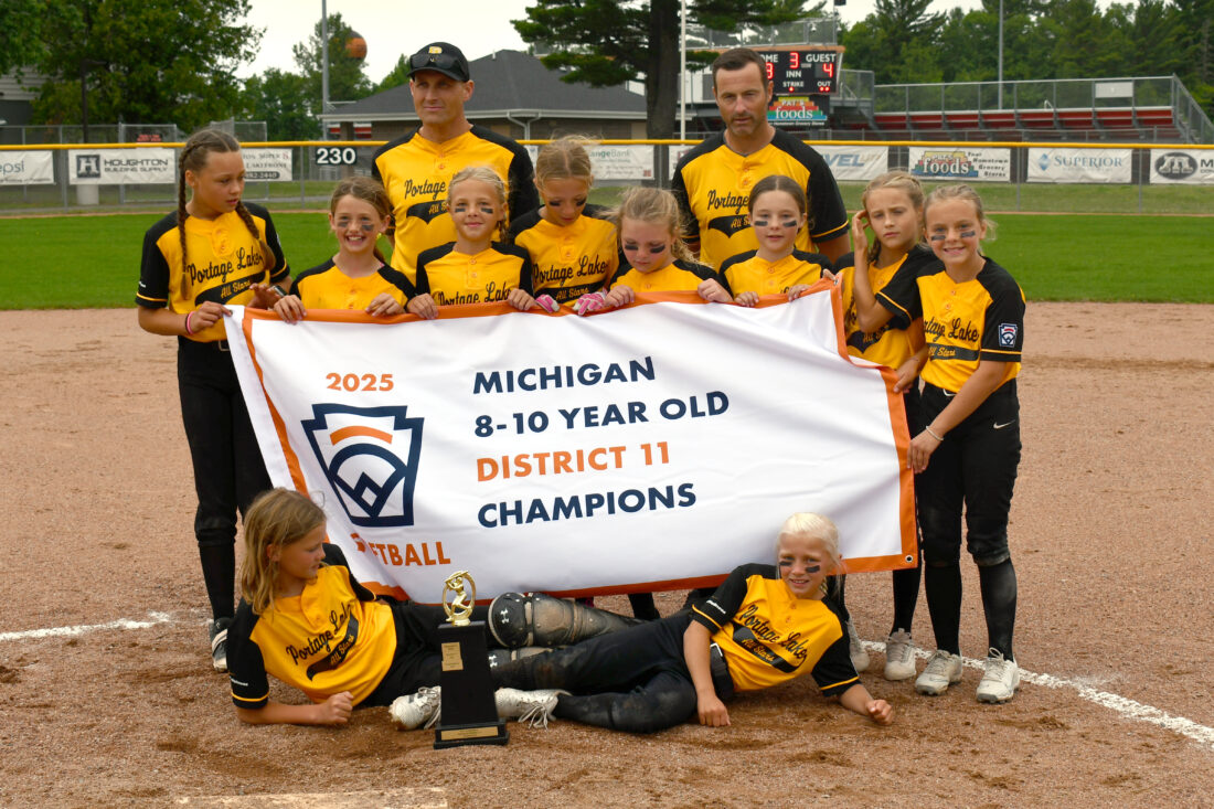 The Portage Lake Little League Minors softball team won the District 11 championship Tuesday over Marquette at the Houghton High School field. The team includes: Avery Pietila, Allie Mettlach, Anna Hanson, Reagan Riley, Miina Heinonen, McKinley Soli, Kylie Helminen, Ivy Biekkola, Hadley Koski, and Ivy Markham. The team is coached by Travis Hanson (left), Dan Mettlach (right), and Phil Pietila (not pictured). (Daver Karnosky/Daily Mining Gazette)