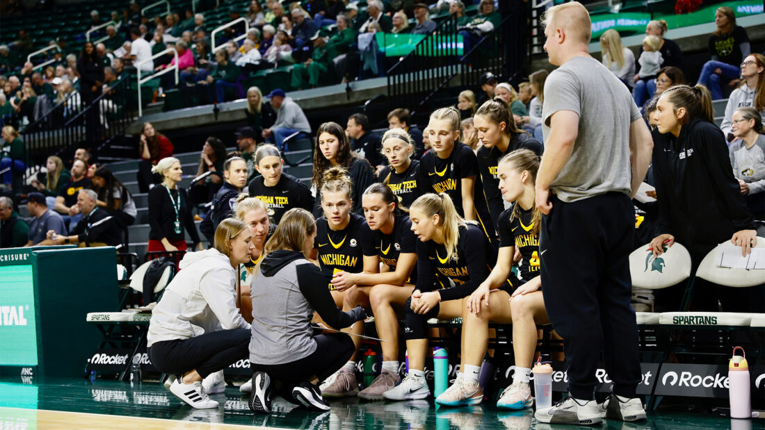Michigan Tech coach Sam Clayton discusses strategy during a time out in an exhibition against Michigan State Wednesday at the Breslin Center in East Lansing. (Photo courtesy of Michigan Tech University)
