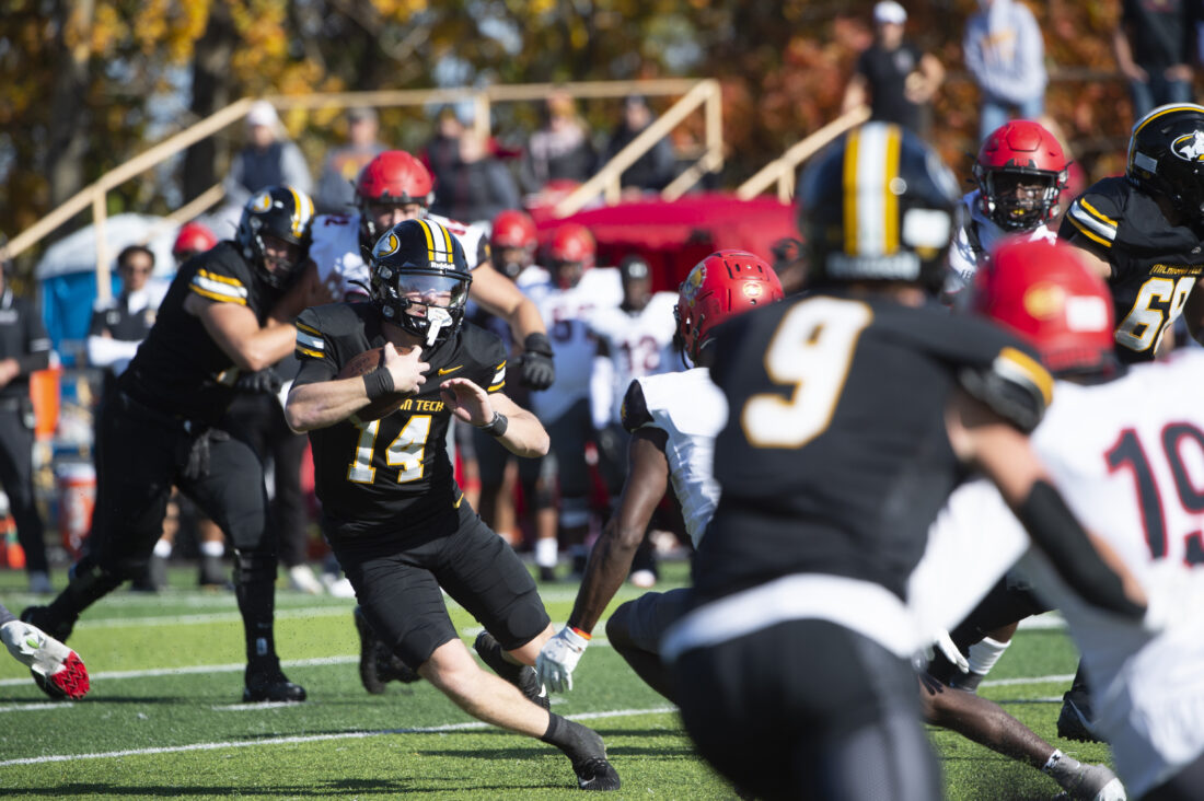 Michigan Tech quarterback Elliott Larner tries to evade a Ferris State defender during a game Saturday at Kearly Stadium in Houghton. (David Archambeau/For the Gazette)