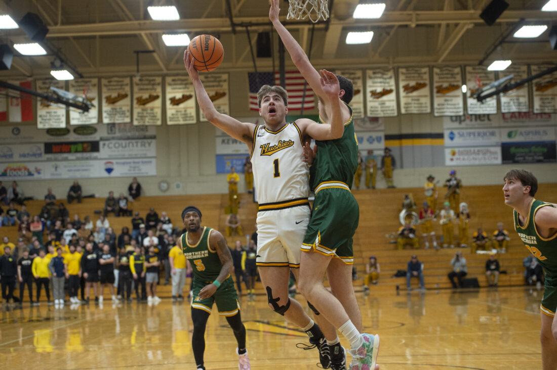 Michigan Tech guard Marcus Tomashek attempts a layup during a game against Northern Michigan Thursday, Feb. 20, at the SDC Gym in Houghton. (David Archambeau/For the Gazette)