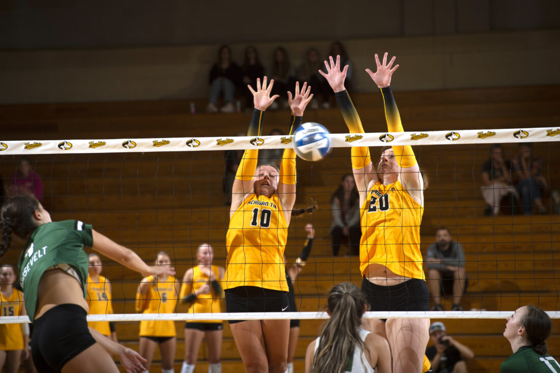 Michigan Tech setter Tess Hayes (10) and middle blocker Tricia Kennedy (20) block a spike attempt from a Roosevelt player during a match Friday at the SDC Gym in Houghton. (David Archambeau/For the Gazette)