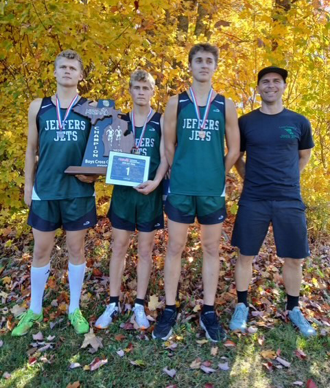 Jeffers’ seniors Cameron Anderson, Landon Larson and Kasen Helminen ended their cross country careers by winning their fourth straight championship. Also included in the photo is coach Sam Kilpela. (Photo provided)