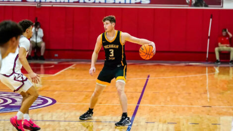 Michigan Tech guard Nate Abel controls the ball while looking for an open teammate during a game Saturday against Maryville at the D2 Midwest Region Tip-Off at Wisconsin Dells, Wisconsin. (Photo courtesy of Michigan Tech University)