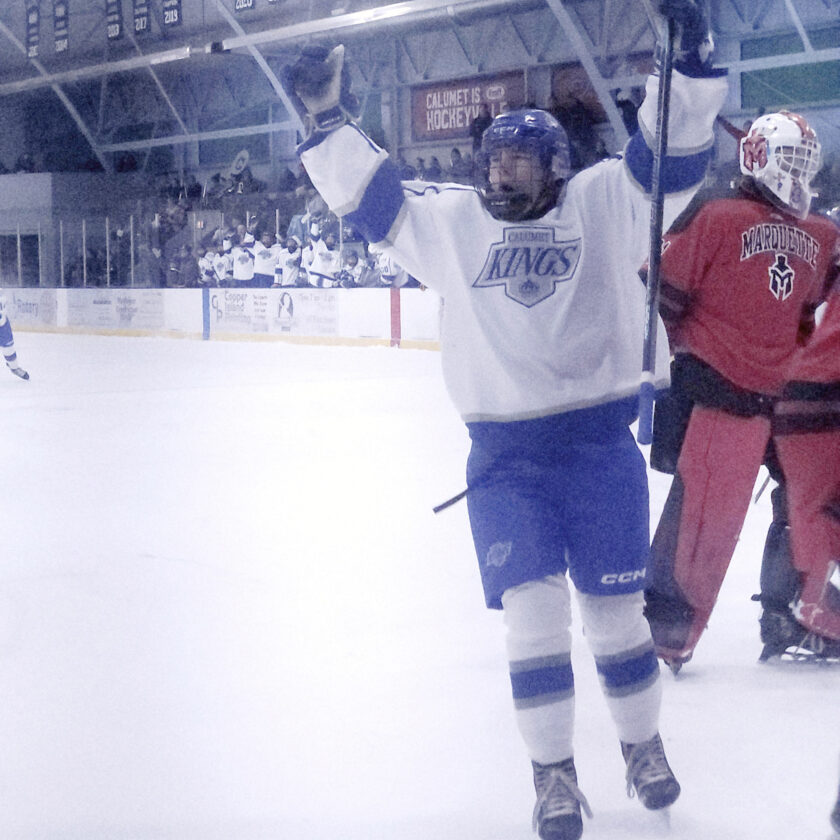 Calumet forward Robert Loukus celebrates one of his two goals Tuesday in a game against Marquette at the Calumet Colosseum. (Paula Porter/For the Gazette)