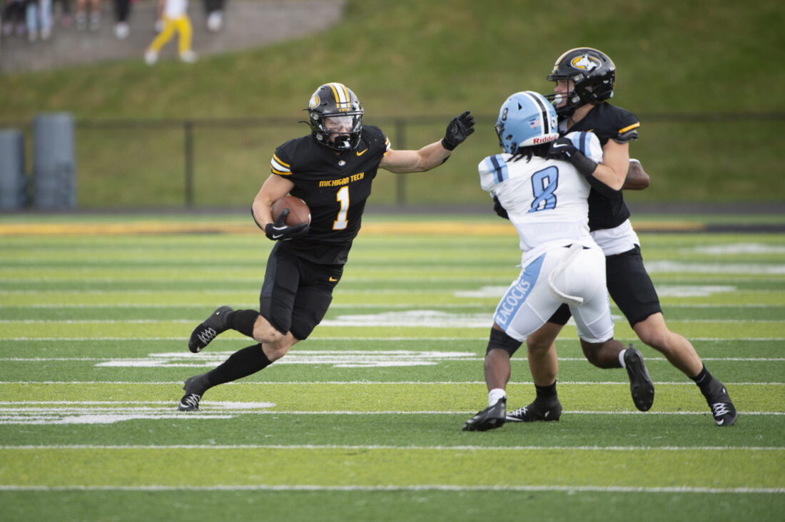 Michigan Tech wide receiver Nic Nora runs with the ball during a game against Upper Iowa Saturday, Sept. 20, at Kearly Stadium in Houghton. (David Archambeau/For the Gazette)