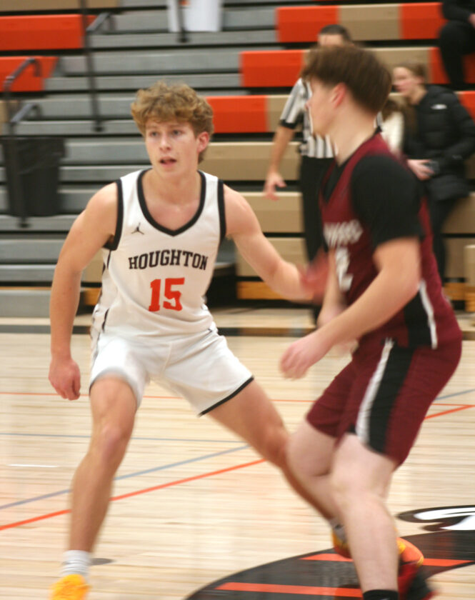Houghton's Henry Lounibos is all defense against Ironwood in a game Monday at the Houghton High School gym. (Eddie O’Neill/For the Gazette)