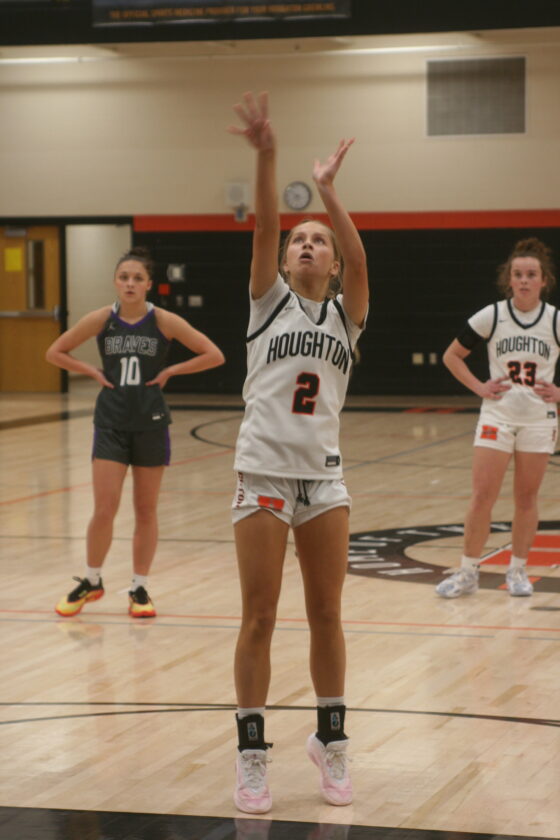 Houghton's Mia Lawson sinks a free throw during a game against Gladstone Friday at the Houghton High School gym. (Eddie O’Neill/For the Gazette)