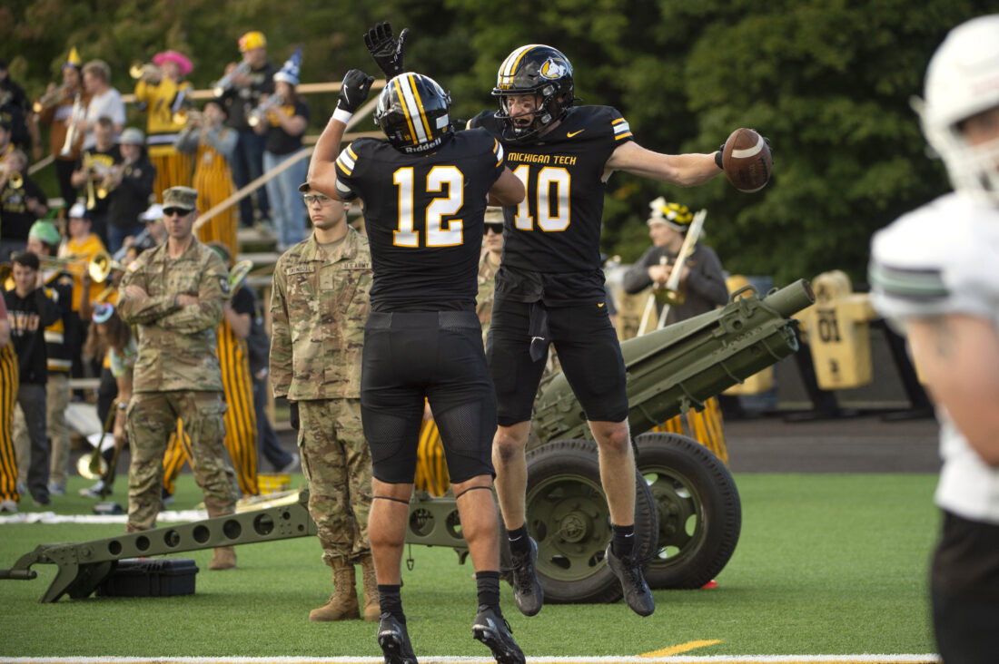 Michigan Tech wide receiver Ethan Champney (10) and tight end Drew Collins celebrate a touchdown catch by Champney during a game against Bemidji State Thursday, Aug. 28, at Kearly Stadium in Houghton. (David Archambeau/For the Gazette)