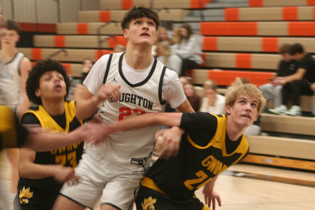 Houghton's Adin Hilts (23) finds himself sandwiched between Gwinn's Gage Jones (left) and Ean Prohn (right) during a game Monday at the Houghton High School gym. (Eddie O’Neill/For the Gazette)