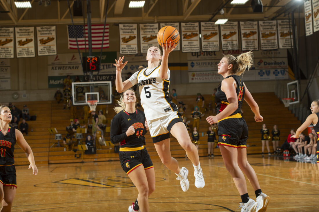 HOUGHTON — The Michigan Tech Huskies women’s basketball team played a great first 17 minutes Saturday, but a three-minute stretch changed things as they fell behind the No. 22 Ferris State Bulldogs by 15 at half. In the second half, that deficit moved to 20 before the Huskies shaved it all way down to five points with 4:33 to play, but ultimately fell, 73-64, to the Bulldogs, at the SDC Gym Saturday.
