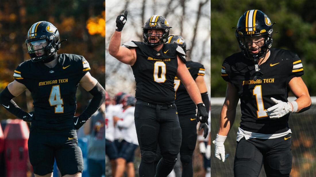Michigan Tech defensive back Dante Basanese (4), defensive lineman Pierce Miller (0), and wide receiver Nic Nora (1) were all selected to the College Sports Communicators’ 2025 Academic All-District Team Tuesday. (Photo courtesy of Michigan Tech University)