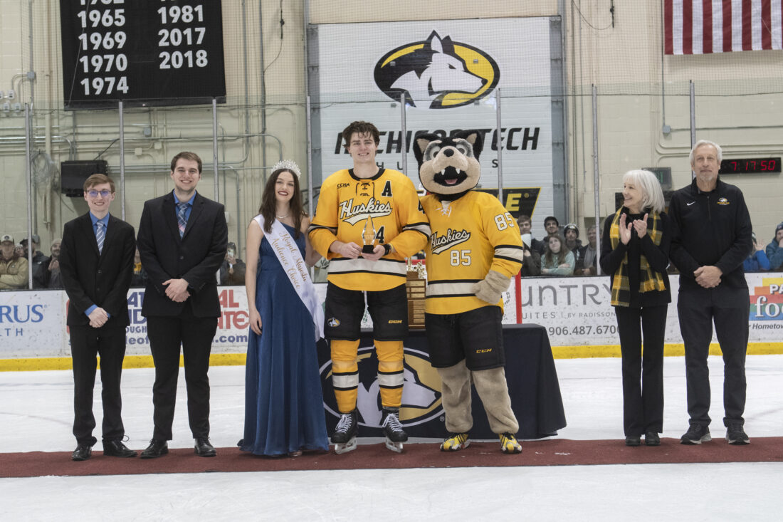 Michigan Tech defenseman Jack Anderson poses with Winter Carnival Royal Majesty Ramie Sussex (left), mascot Blizzard T. Husky, and Betty and Scott MacInnes (right) after winning the Most Valuable Player award after a game Saturday at the MacInnes Student Ice Arena in Houghton. (David Archambeau/For the Gazette)