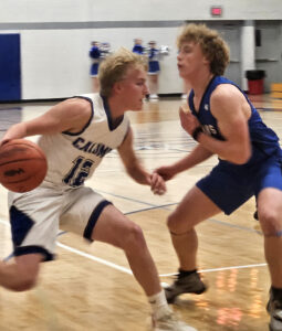 Calumet’s Peter Torola looks for a way around a West Iron County defender during a game Friday at the Calumet gym. (Paula Porter/For the Gazette)