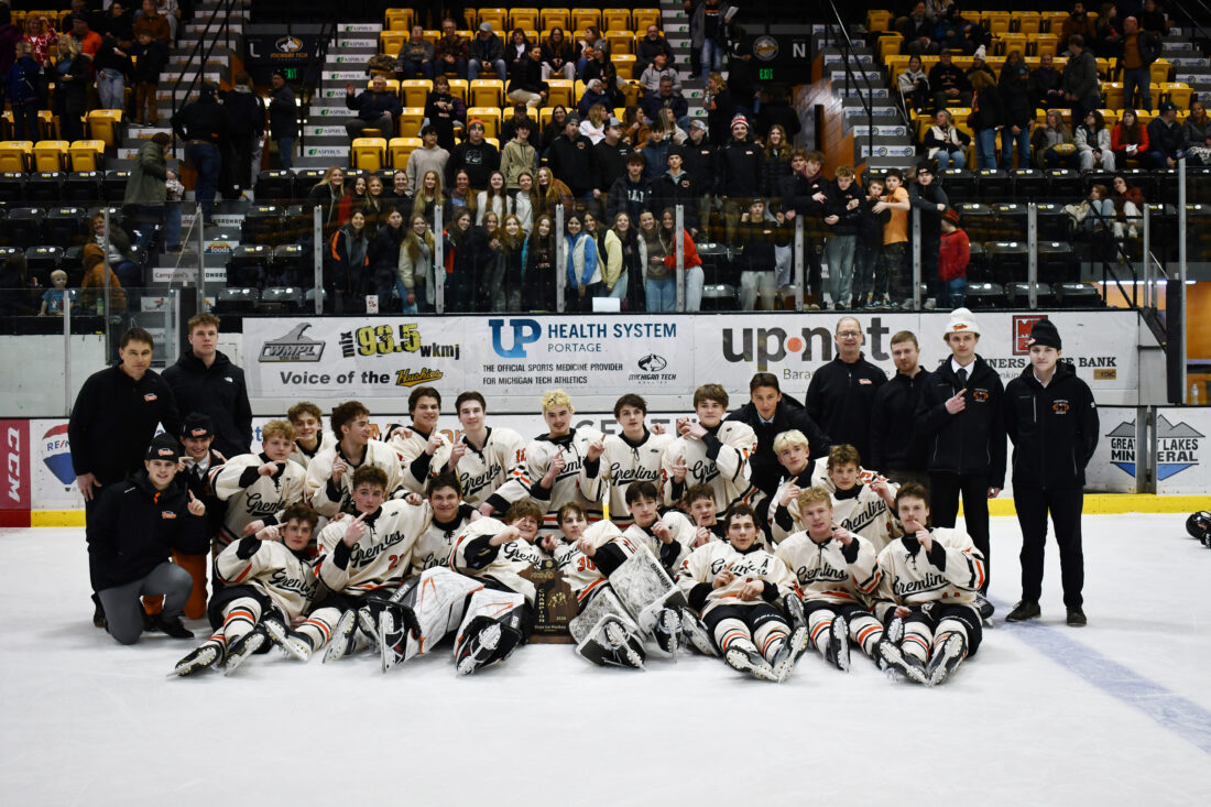 The Houghton Gremlins pose after winning the Division 3 Region 17 championship over Calumet Wednesday at the MacInnes Student Ice Arena in Houghton. Pictured are Brycyn Nettell, Gage Gullstrand, Cale Repp, Wesley Mattila, Kade Jenkins, Jake Mattson, Calvin Rinkinen, Chad Halonen, Braden Kari, Porter Markham, Jack Sayen, Gunner Flachs, Noah Maillette, Brody Donnelly, Mason Soli, Max Aldrich, Liam Frick, Ian Hembroff, Connor Arko, Brendan Jukuri, Gunner Gullstrand, Lucas Mayra, and Cooper Flachs. They are coached by Micah Stipech, Rod Wakeham, Brent Peterson, Will Stier, and Andrew Lampinen. (Daver Karnosky/Daily Mining Gazette)