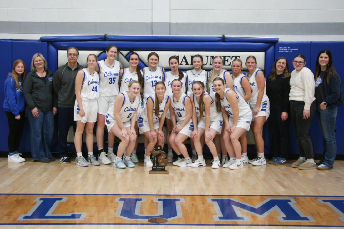 The Calumet girls basketball team is all smiles as they pose with the Division 3 District 65 trophy after defeating Westwood Friday in the Calumet gym. The Copper Kings are Mille Loukus, Kaitlynn Pennala, Bailey Strom, Chloe Coppo, Neva McParlan, Bethany McParlan, Cara Halonen, Rita Eskola, Maretta Kangas, and Kiirsi Johnson. Front row (from left): manager Abby Hampton, Kyla Strom, Jess Anderson, Linnea Pennala, Cali Hodges, and manager Ava Giachino. They are coached by Charlie Kemppainen. (Eddie O’Neill/For the Gazette)