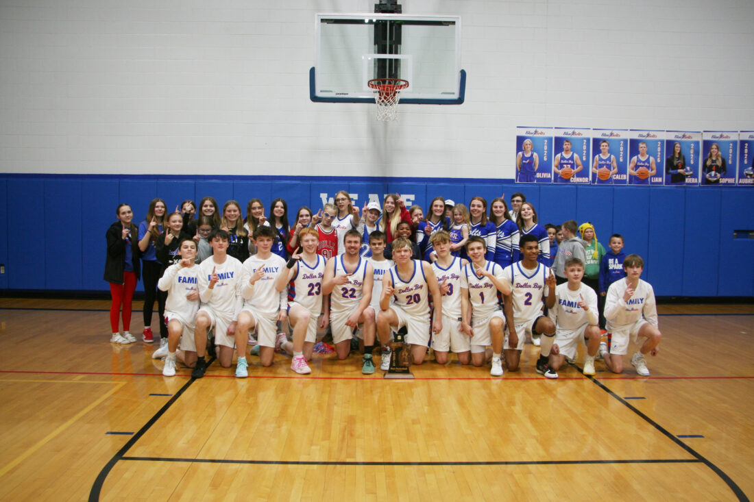The Dollar Bay-Tamarack City boys basketball team poses after winning the Division 4 District 98 championship game over Baraga Friday at the Dollar Bay-Tamarack City gym. The Blue Bolts are Caleb Kentala, Baron Colbert, Bennett Stevens, Guyius Gerous, Landon Halkola, Niko Reed, Dane Torrey, Tyler Jaehnig, Connor Laitala, Liam Tourtillott, and Noah Tourtillott. (Eddie O’Neill/For the Gazette)