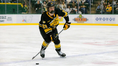 Michigan Tech defenseman Joe Prouty carries the puck up the ice while looking for a teammate to pass to during a game this season. (Photo courtesy of Michigan Tech University)