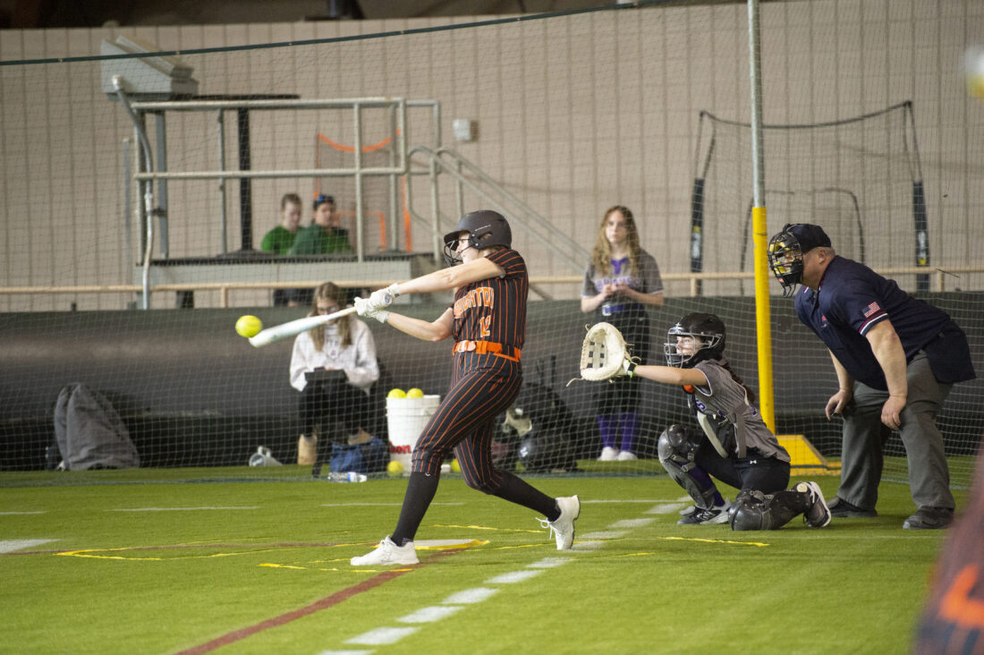 Houghton first baseman Josie Switzer connects with a pitch during a game Saturday at the Spring Swing tournament at the Superior Dome in Marquette. (David Archambeau/For the Gazette)