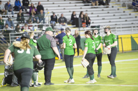 Jeffers coach Wes Frahm addresses his infield during a break in the action during a game in the Spring Swing tournament at the Superior Dome in Marquette. Also pictured are Svea Johnson (2), Savannah Hendrickson (3), Pearl Raffaelli (4), and Meg Ruhonen (15). (David Archambeau/For the Gazette)