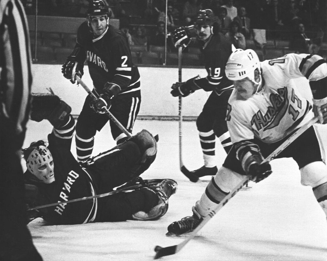 Michigan Tech forward Bill Steele scores a goal against Harvard in a 1974 NCAA semifinal game against Harvard at the Boston Garden in Boston, (Photo courtesy of Michigan Tech University)