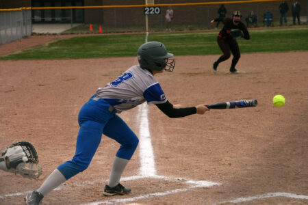 Calumet’s Molly Erkkila lays down a bunt in a game Monday against Houghton at the Houghton High School Field. (Eddie O’Neill/For the Gazette)
