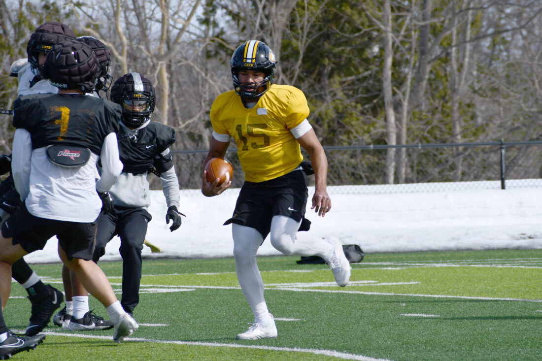 Michigan Tech quarterback Alex Bueno runs the ball during a practice this spring at Kearly Stadium in Houghton. (Daver Karnosky/Daily Mining Gazette)