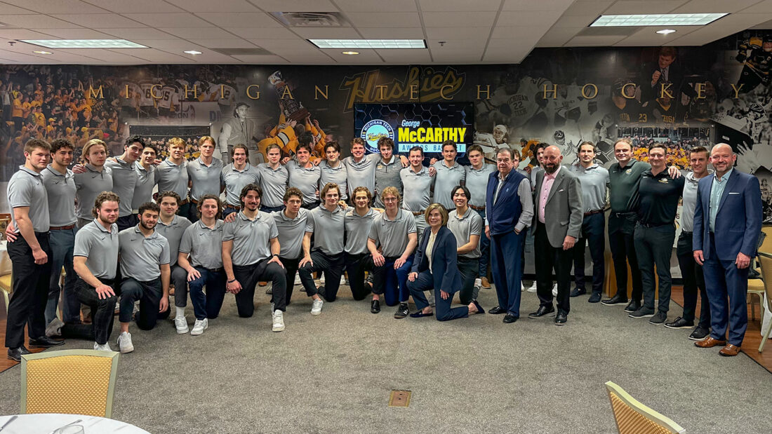 The Michigan Tech hockey team poses after celebrating the 2025-26 season with the third annual George McCarthy Hockey Awards Banquet. Pictured are: Tom Leppa, Rylan Brown, Max Matthews, Brayden Boehm, Kasper Vaharautio, Kalem Parker, Carson Latimer, Elias Janssen, Owen Baker, Ryan Abraham, Tyler Miller, Max Koskipirtti, Carson Birnie, Isaac Gordon, Reid Daavettila, Noah Reinhart, Michael Cicek, Reid Andresen, Matthew Van Blaricom, Trevor Kukkonen, Braden Pietila, Luca Fasciano, Lauri Raiman, Teydon Trembecky, Ryder Matter, Bryant Lee, Owen Bartoszkiewicz, Ryan Manzella, and Stiven Sardarian. Also pictured are head coach Bill Muckalt, assistant coaches Benton Maass, L.J. Scarpace, and Tyler Shelast, along with Director of Hockey Operations Maxx Fredrickson, Bill McCarthy, and Kathleen Marsal. (Photo courtesy of Michigan Tech University)