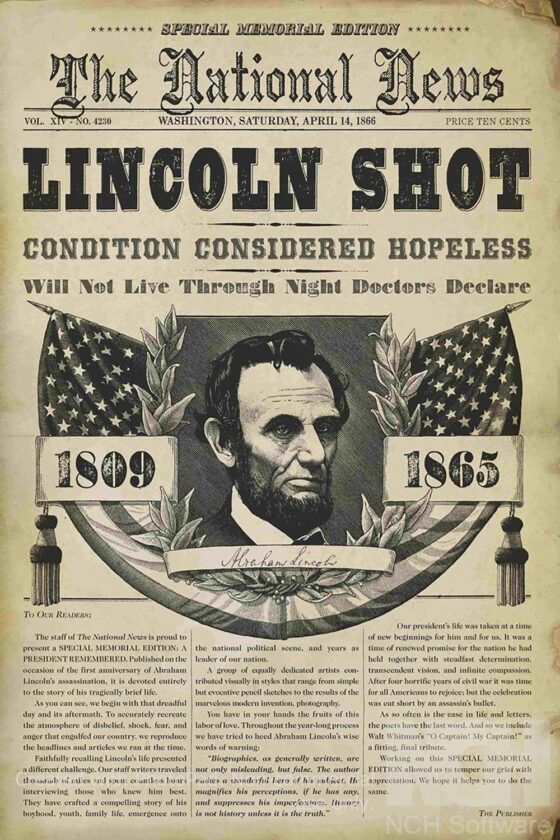 On April 14, 1865, President Abraham Lincoln was shot and mortally wounded by John Wilkes Booth during a performance of the play “Our American Cousin” at Ford’s Theatre in Washington; Lincoln was taken to a boarding house across the street and died the following morning at 7:22 a.m.