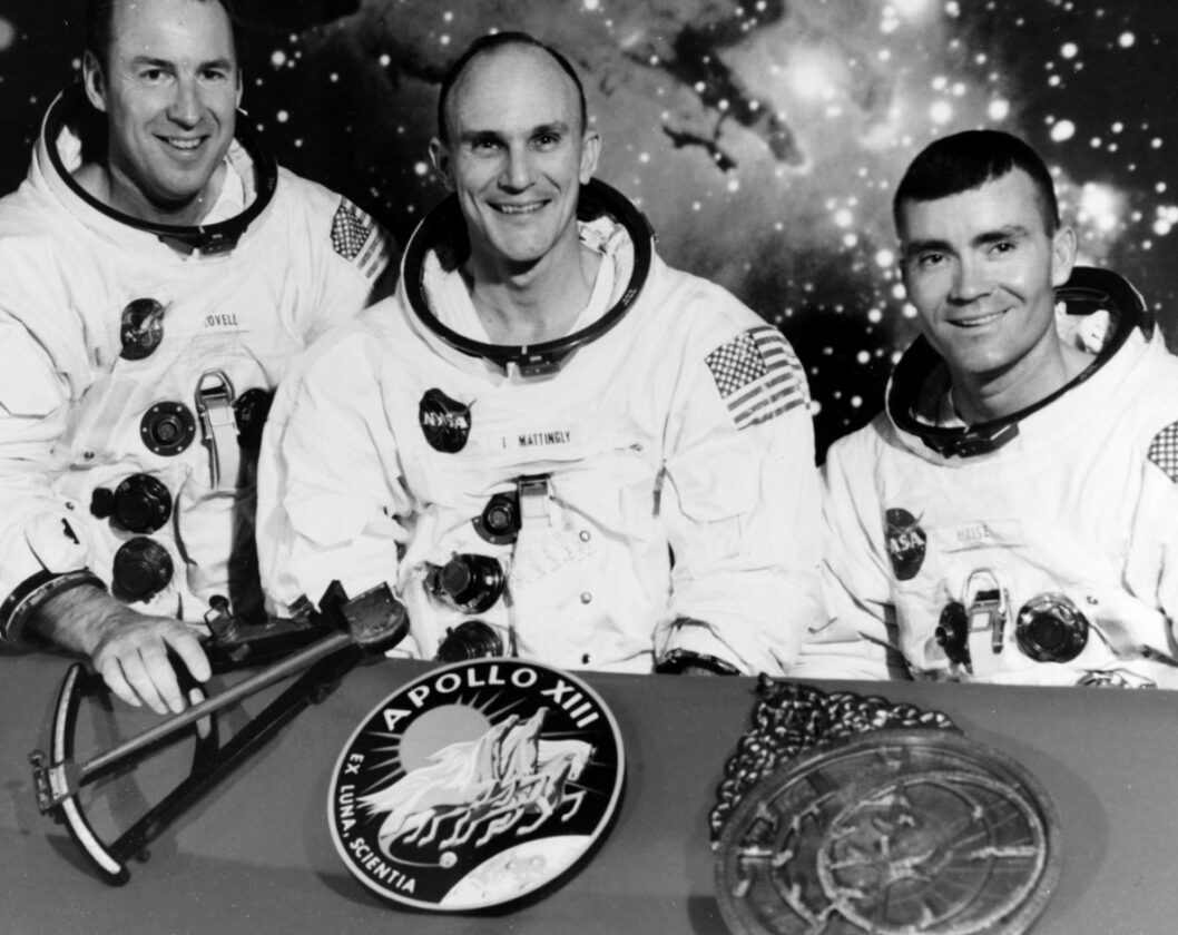 US Navy photo The prime crew of the Apollo 13 Lunar Landing Mission. From left: Captain James A. Lovell Jr., USN (commander); Lieutenant Commander Thomas A. Mattingly Jr., USN (command module pilot); and Fred W. Hais Jr. (lunar module pilot). They are seated behind the mission emblem (center), sextant on left, and astrolabe on right. Houston, Texas, December 1969.