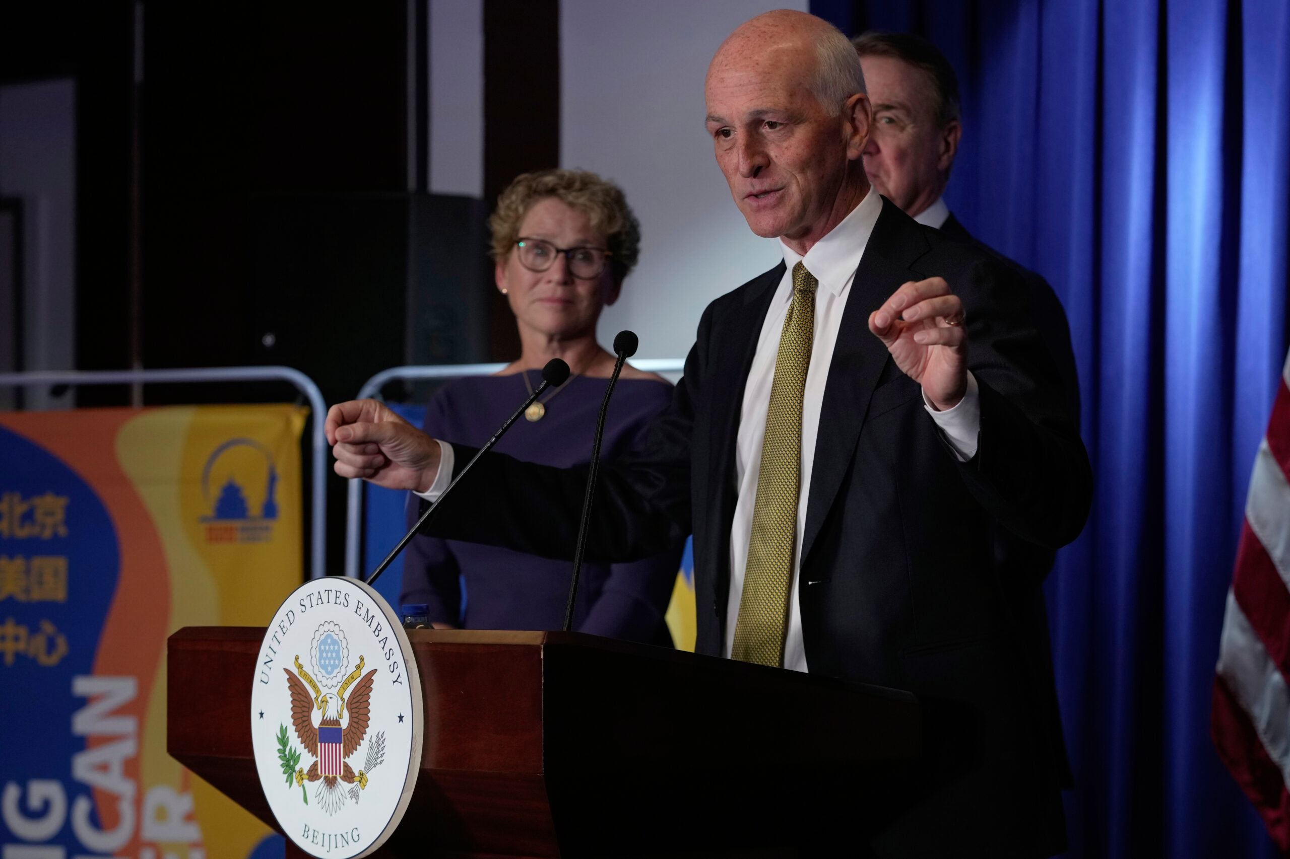 U.S. Rep. Adam Smith, D-Wash, center, speaks during a press conference at the U.S. Embassy in Beijing, China, Tuesday, Sept. 23, 2025. (AP Photo/Mahesh Kumar A.)
